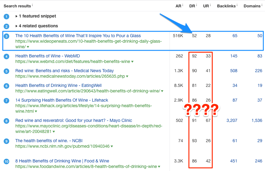 下圖是顯示了一間小企業即使網域排名不高,卻還是可以打敗大企業的例子。